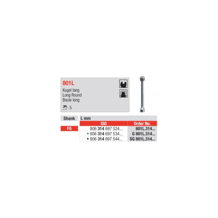 Freza globulara cu gat lung diamantata 801L este utilizata la turbina pentru preparatia cavitatilor ,preparatia coronara.